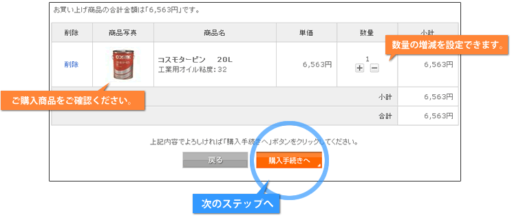 カゴの中をご確認ください。商品、粘度、数量などをご確認いただけましたら、「購入手続きへ」をクリックしてください。